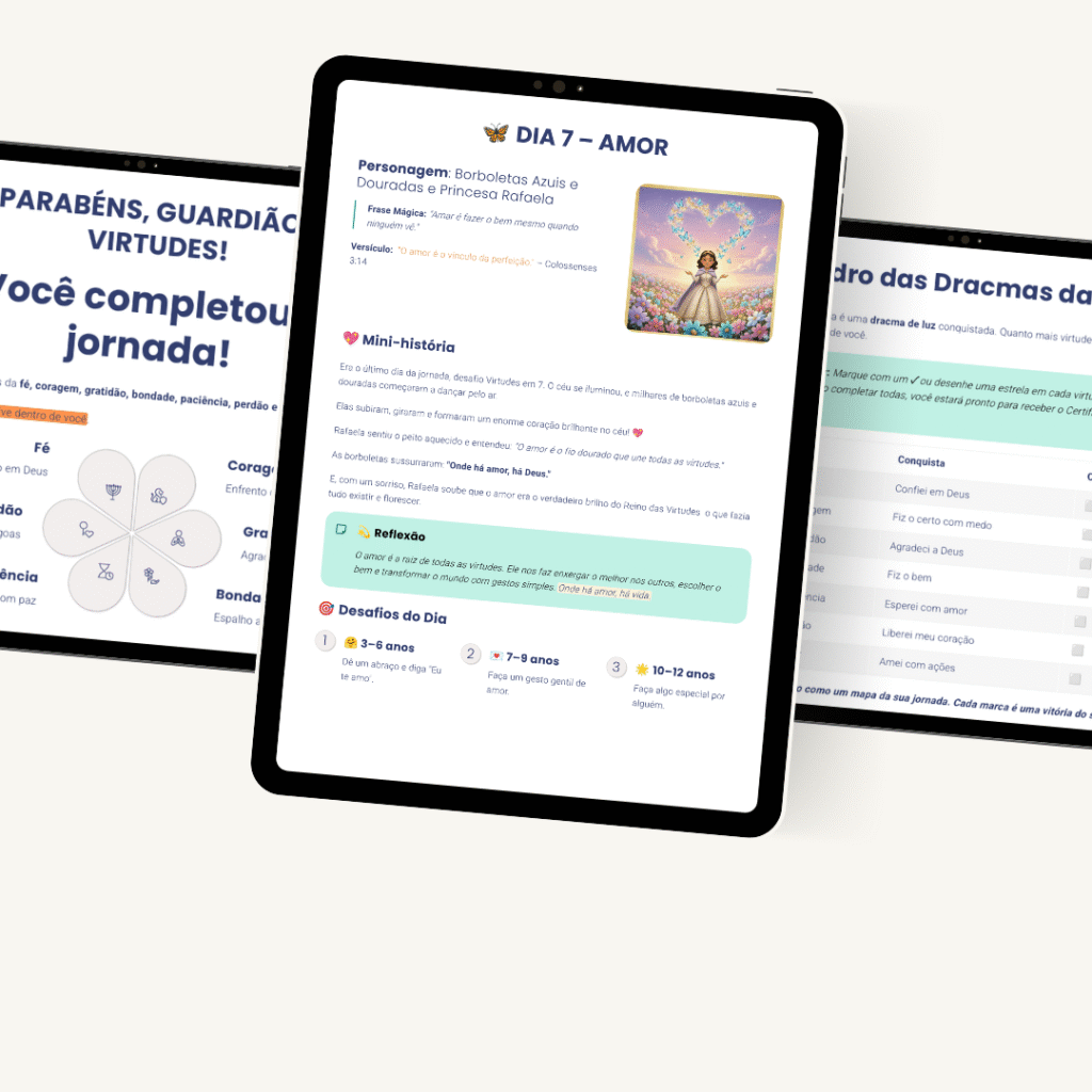 Atividades simples e rápidas separadas por faixa etária, que transformam cada virtude em ação real no dia a dia sem complicação.