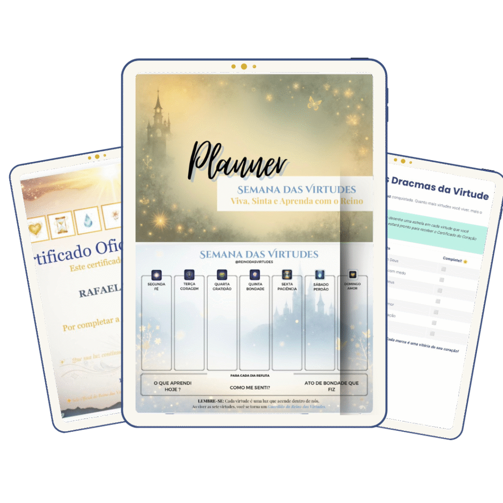 Atividades simples e rápidas separadas por faixa etária, que transformam cada virtude em ação real no dia a dia sem complicação.